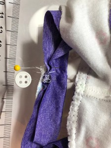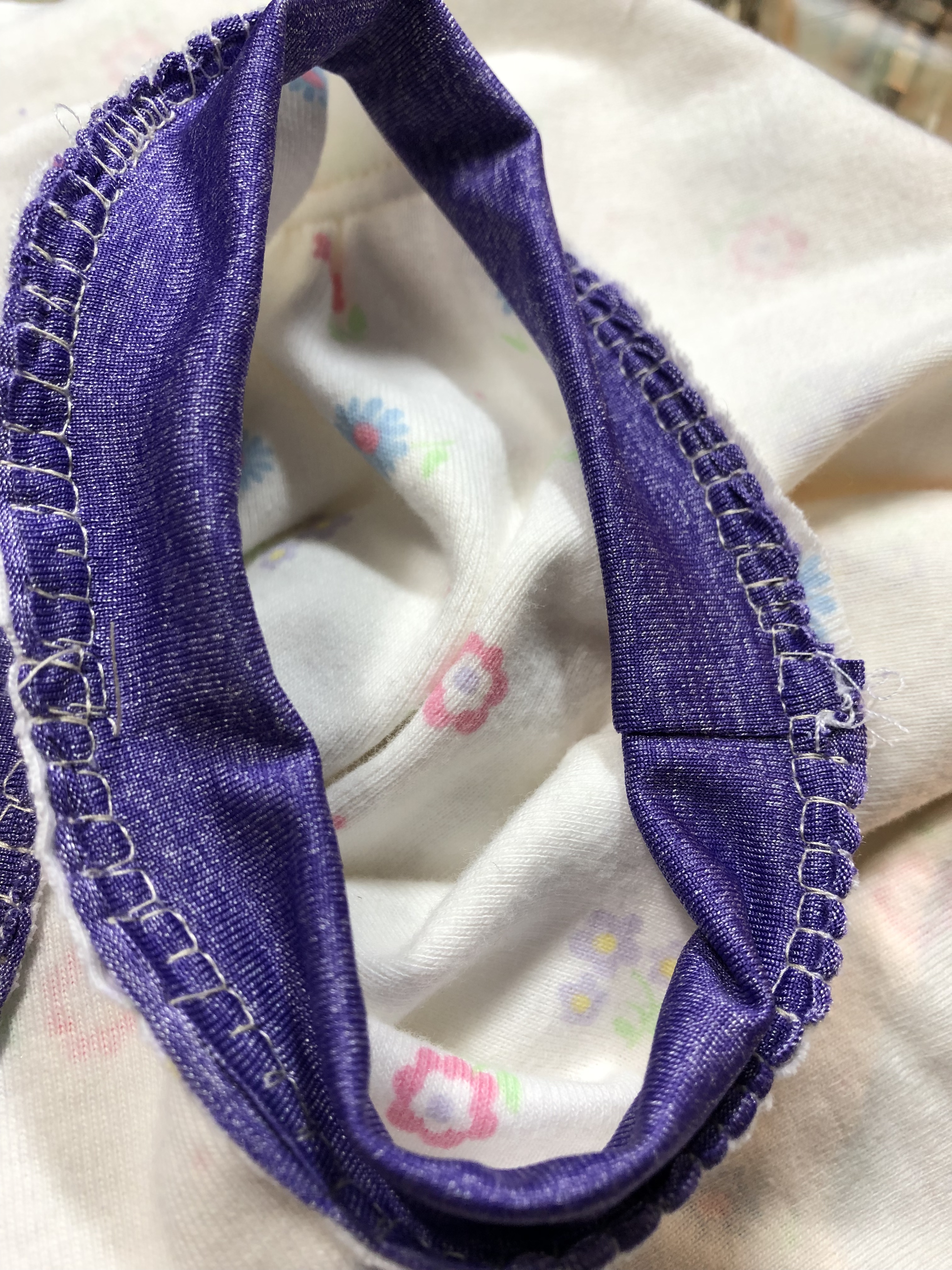It was simple enough to figure how much I wanted to go around my under bust, serge a single layer to the same color side, right sides together, and wrap that around my elastic tuck it under and top stitch it to the other side. Best to use bobbin thread to match the fabric underneath, to stitch on the contrasting side, so you can see where to sew!