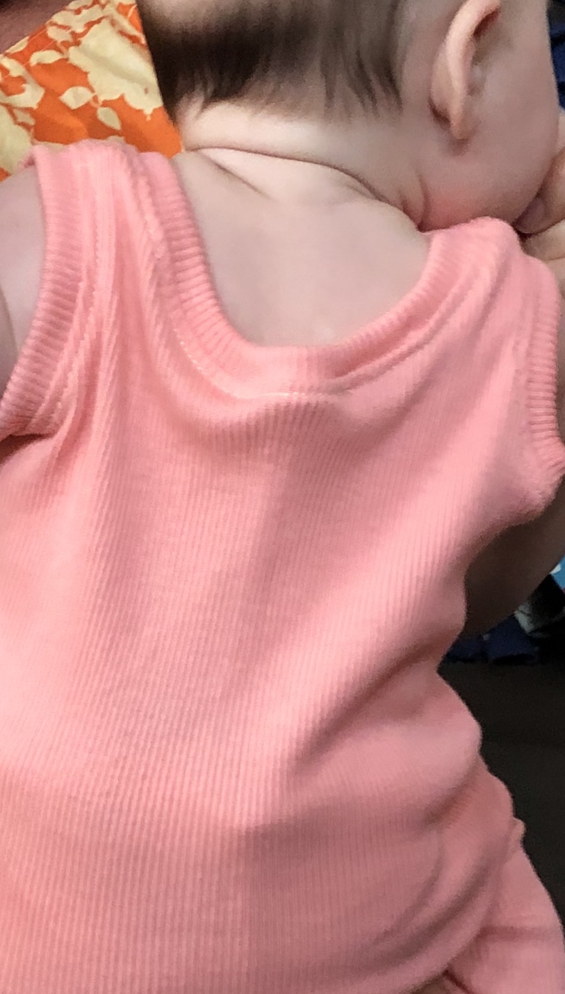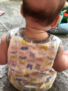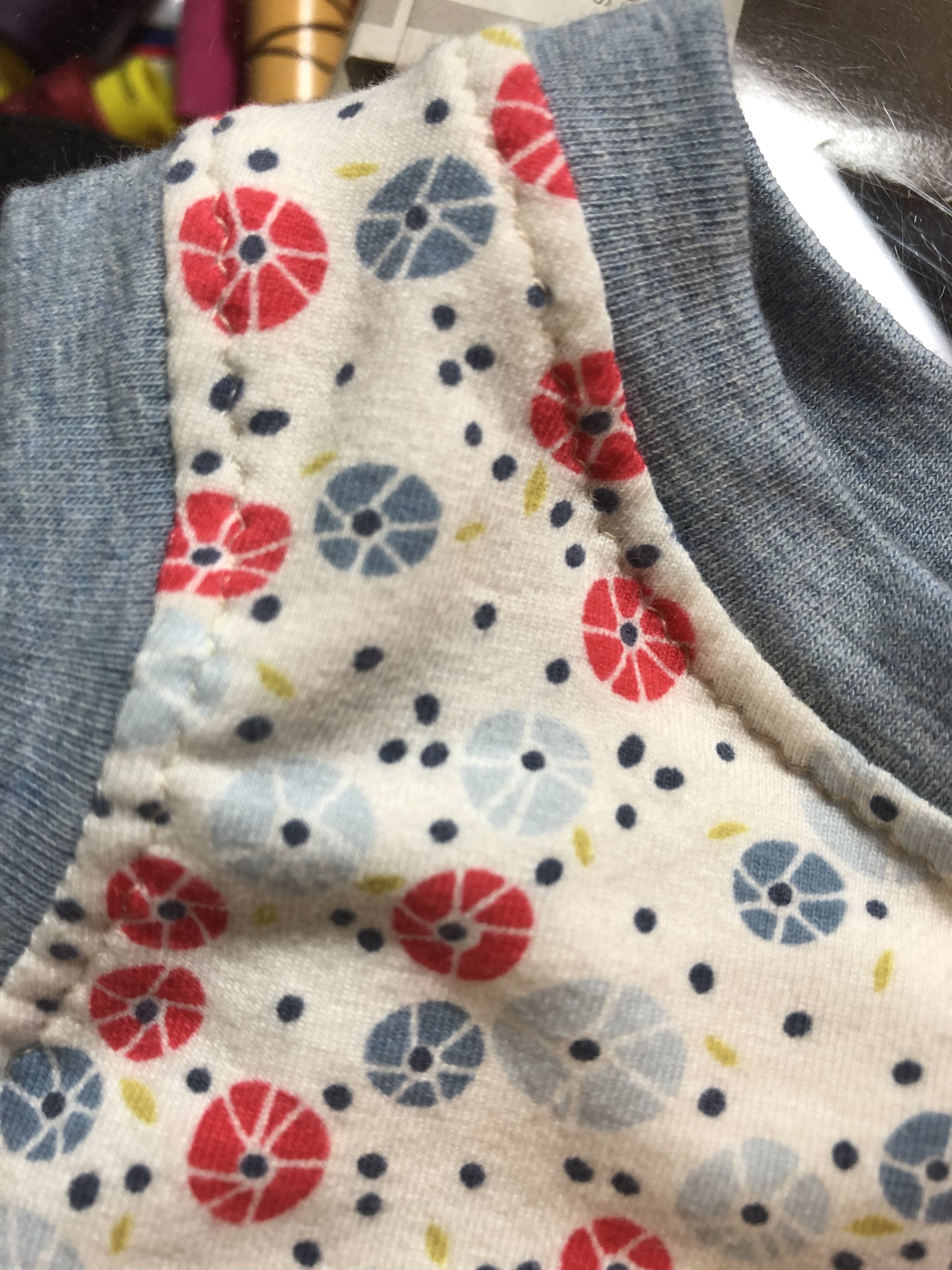 4. I pressed that seam outwards, and decided which side would get the pop of color and folded back 5/8 inch of this edge (top of one breast, around the back to the top of the other), pinned, and stitched it down to make a casing. Since that edge was finished, it turned out pretty on both sides. ** Note going forward I would leave the back un sewn about 4 inches from either side of center. This would make it easier to slip in those straps.