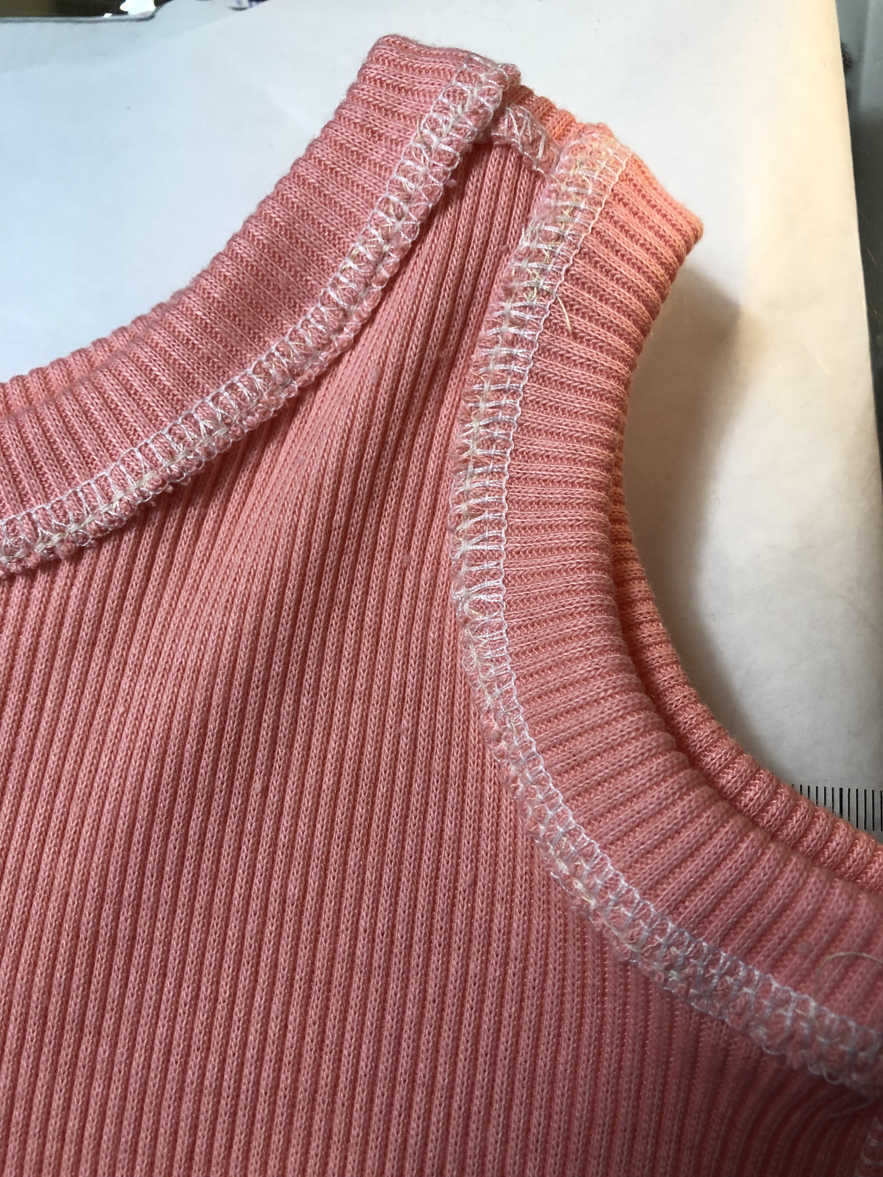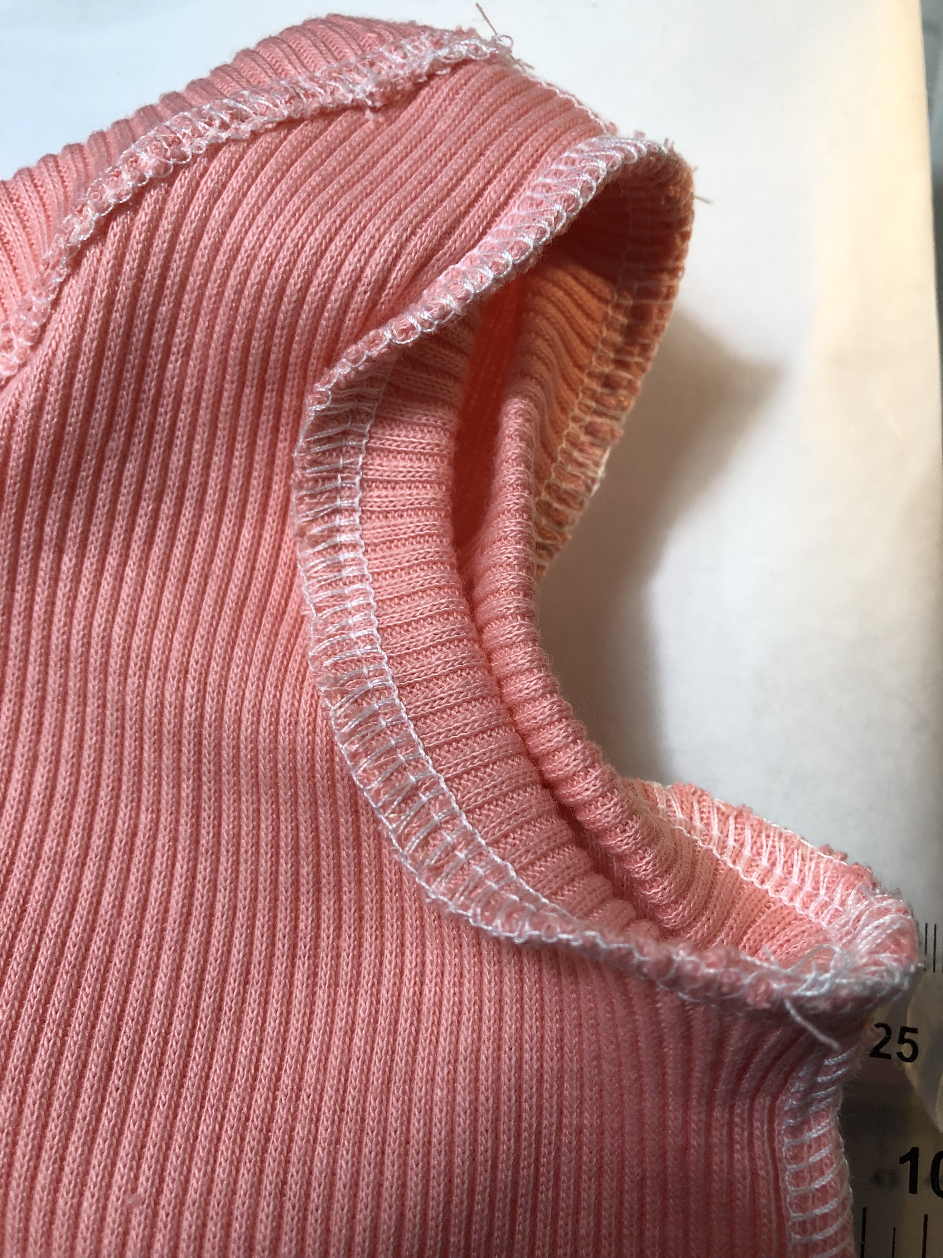 6. Now to finish the bottom of the bra. If I had cut it one inch longer, then it would be super easy to serge the ring of elastic around the bottom, flip it back twice and top stitch like I did on the agility here.