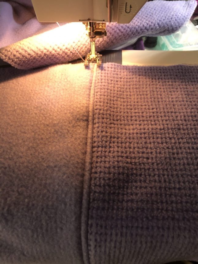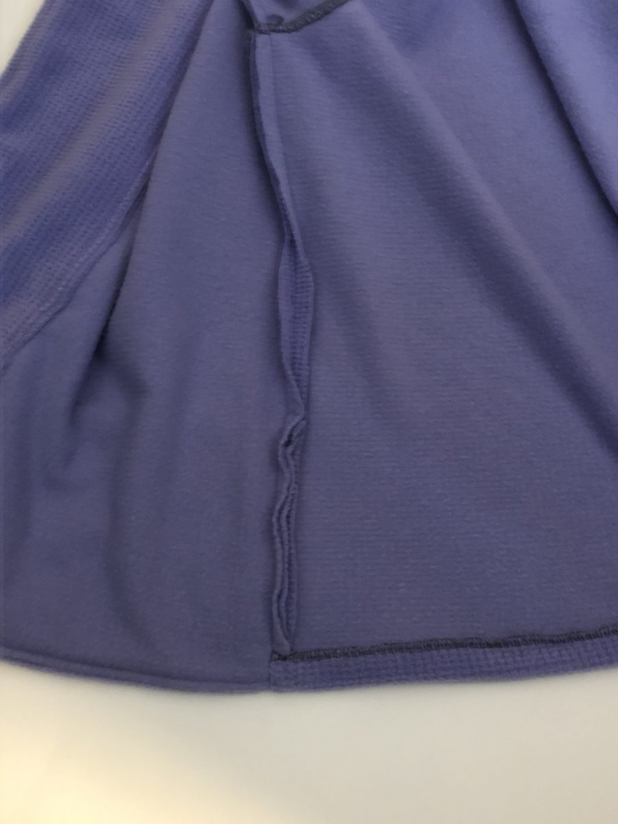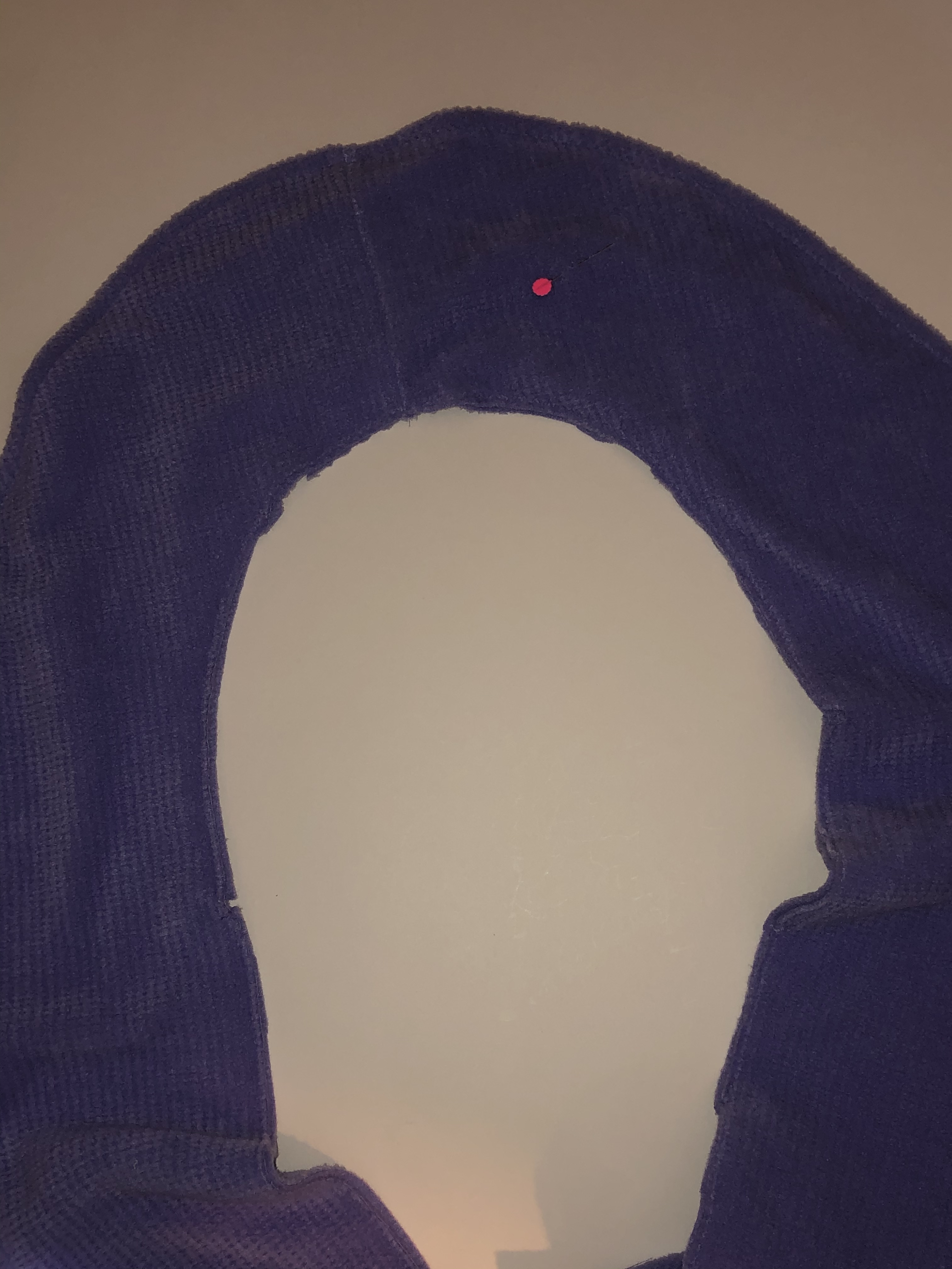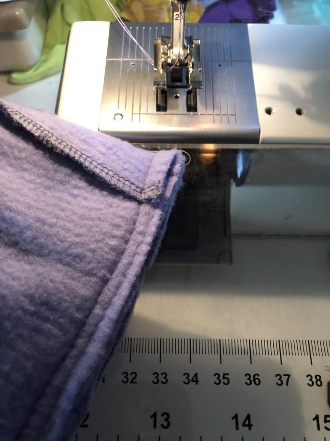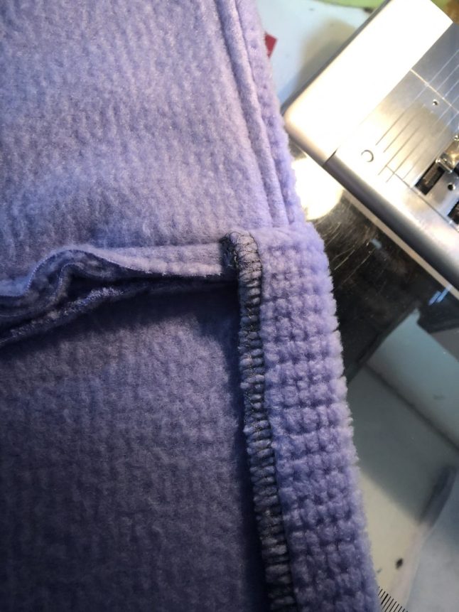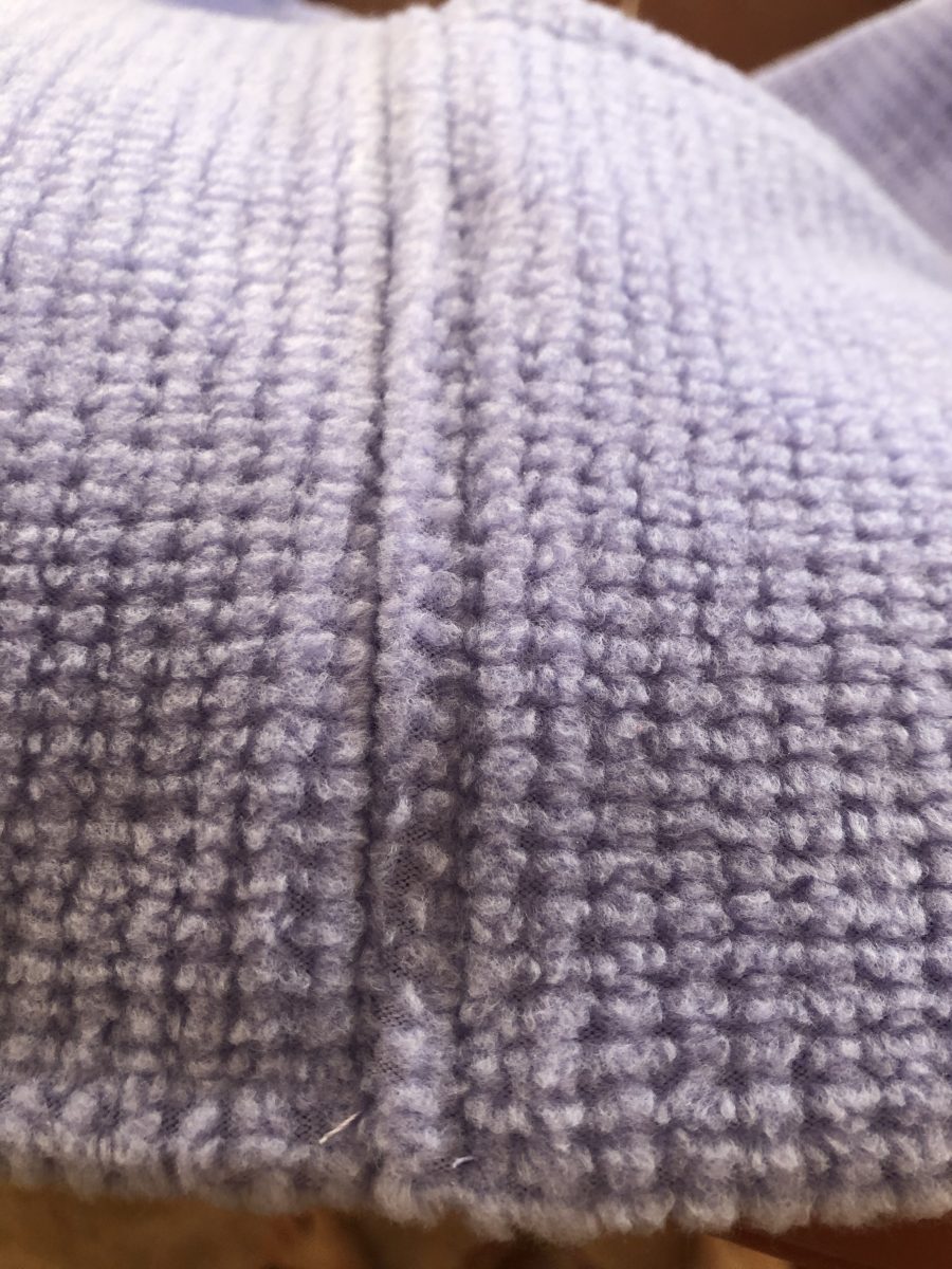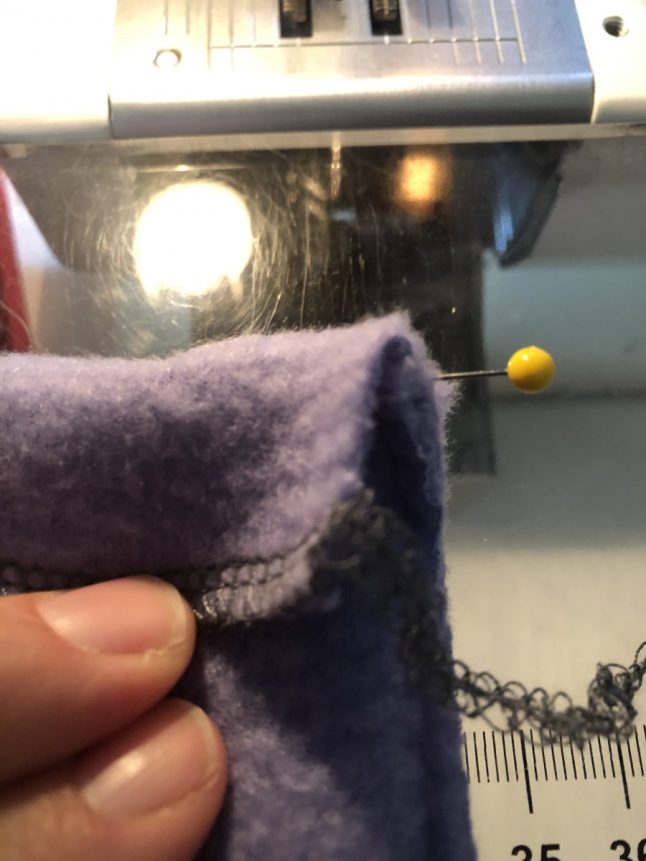 Pin the collar to the body. With the inner collar facing the right side of the body of the garment, pin along the edges, matching the front bottom edges, notches, center back, then add more pins in between as needed. Stitch all the way round. I used a 4 length with a slight .5-1 zig zag for stretch. After you decide you like it, you may clean finish the edge if desired. I used the overcast stitch on my sewing machine for two reasons. Matching thread, and it can handle the multiple layers of fleece more happily than my serger can. ***Adventurous tip here.