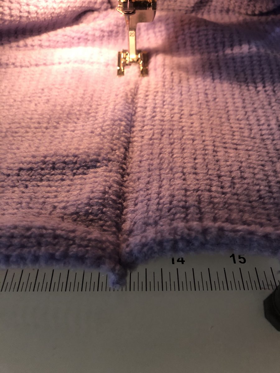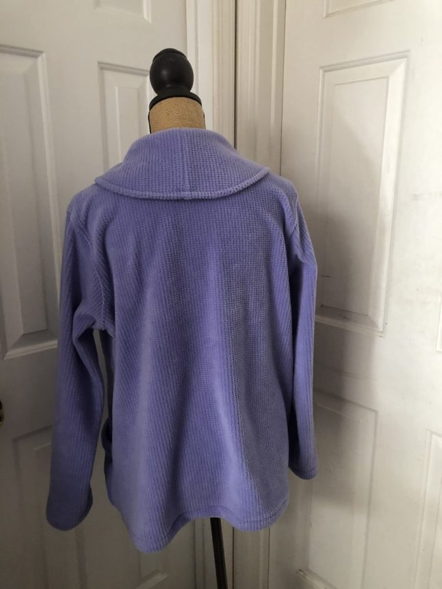 • The other side of the zip will be installed here. ** You are responsible for determining which side of the shawl collar it goes on and which side faces up. On the version I made, this is where the zipper pull side of the zip was sewn. Perhaps a reversible separating zip might make the whole process easier, as it would be hard to get the zip in “backwards”.