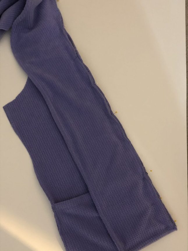 Pin and sew your side seams. If the universe is happy with you, your back piece will be about an inch longer than your front pieces. Use this to roll round the edge of your nicely finished front piece. Snug is key here. Make your side seam. Repeat for the other side.