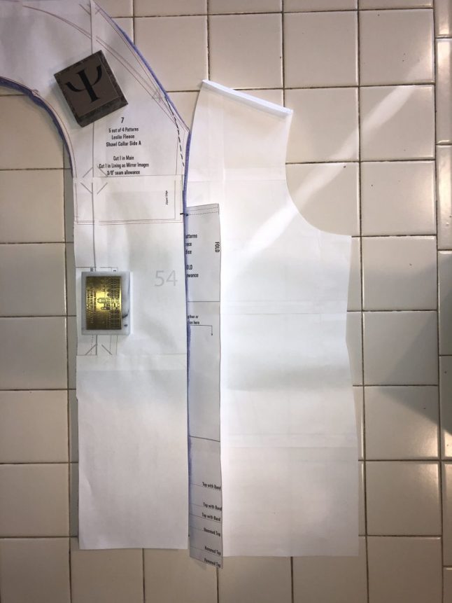 To begin, I altered two pattern pieces. Both the front, and the shawl collar. For the front, I simply folded back the few inches of the center front. I marked where the seam lines of the bottom of the placket and the top of the shirt would normally meet, and created a new “notch” or marking both there and on the other side of my shawl.