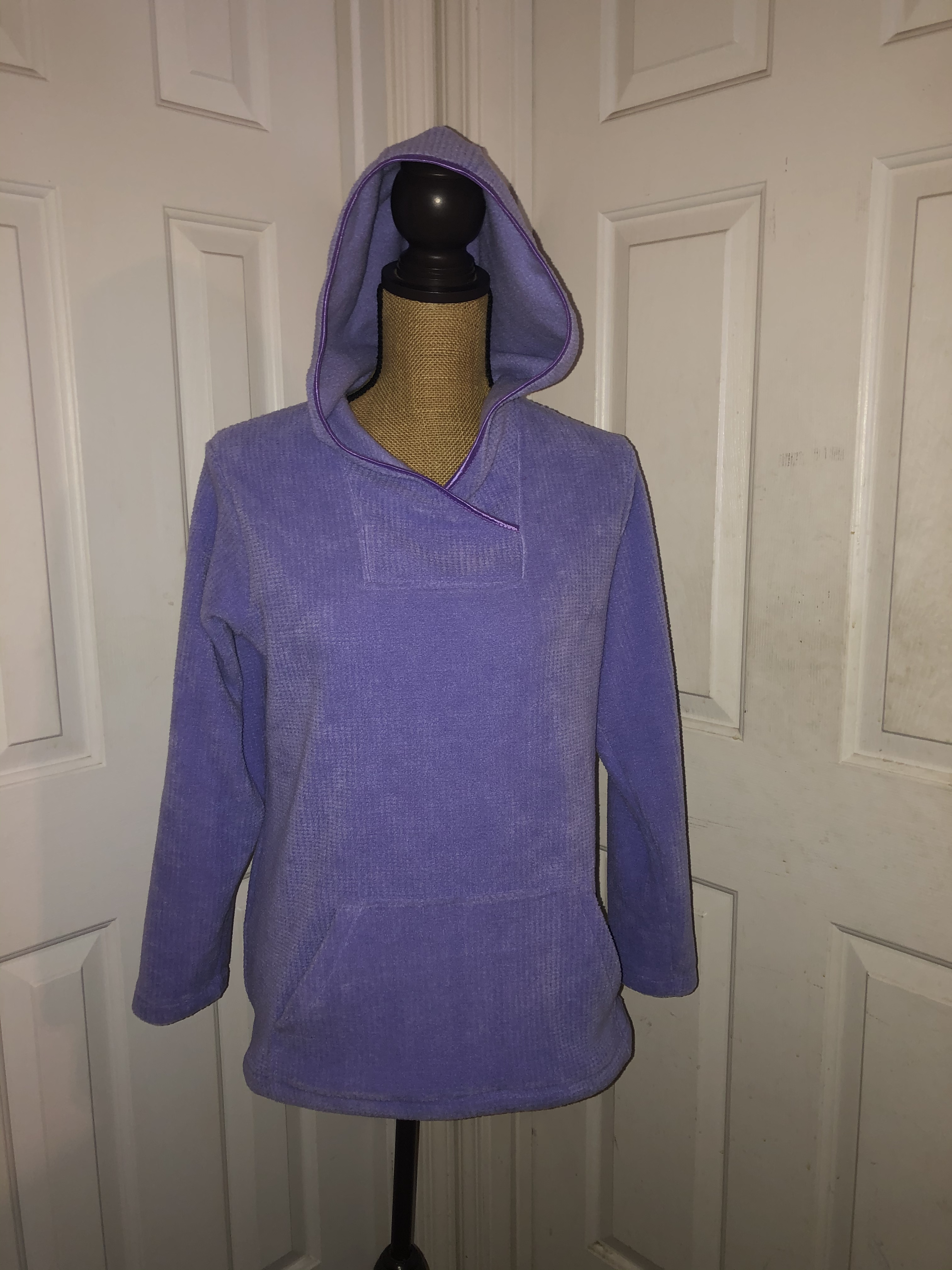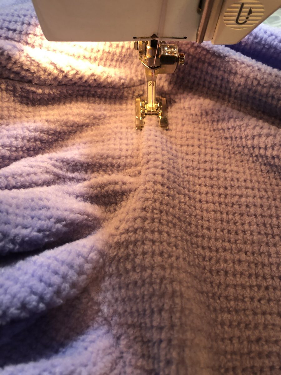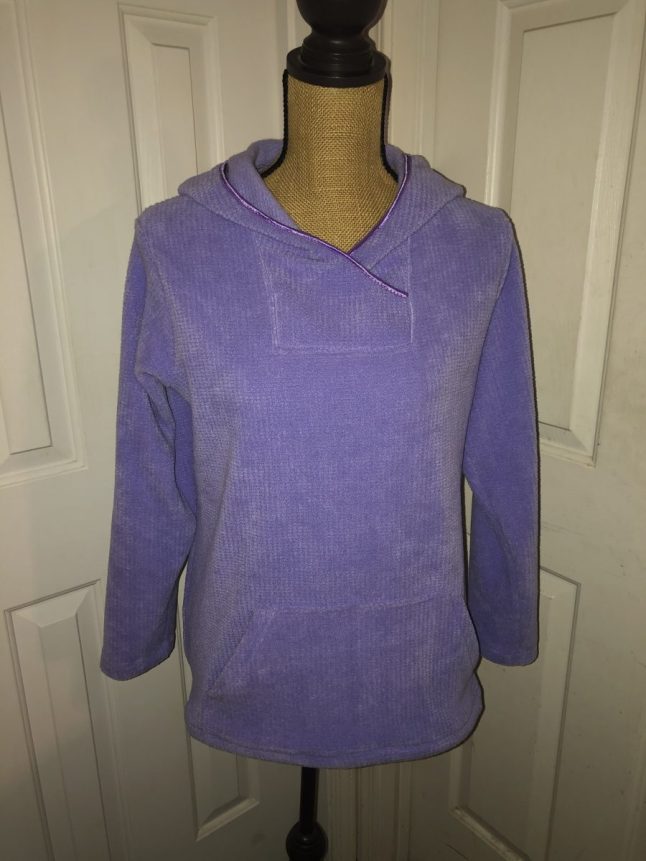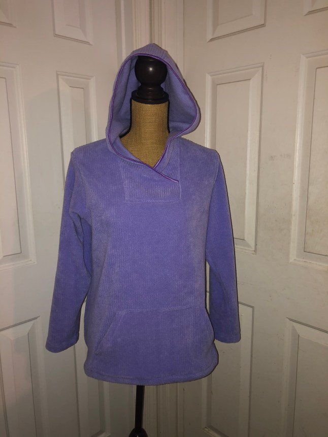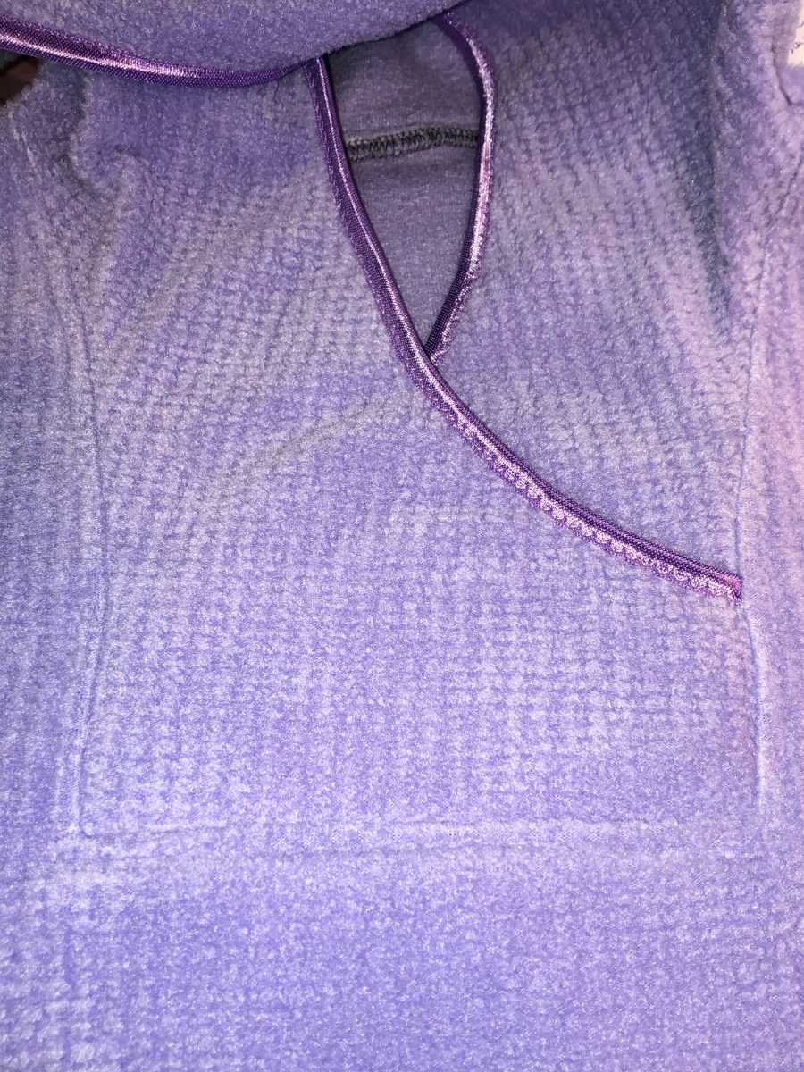 At a request for zoom friendly tops that feel like sweatshirts, and have pockets, I experimented with the Leslie from 5 out of 4 patterns. The pattern is fabulous as is. My husband found this textured fleece in my stash and suggested our daughter would love it. A lighter weight fleece is a great way to start with this pattern due to the square neckline, corners and lots of layers. I skipped the zip for two reasons. 1. She is a fiddler. The last thing she needs to be doing is fiddling with the zipper on her collar during a work meeting, and 2. Despite the massive amount of zippers I have in my stash, there were none this color. Turns out that made things even more simple to put together. This is a great way to try out the pattern for fit and style before attempting a zipper. A confidence builder.
