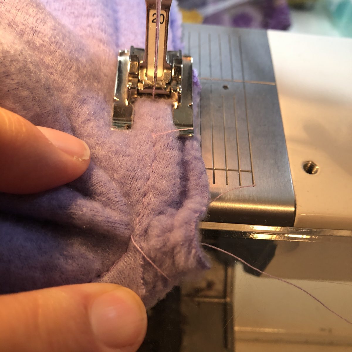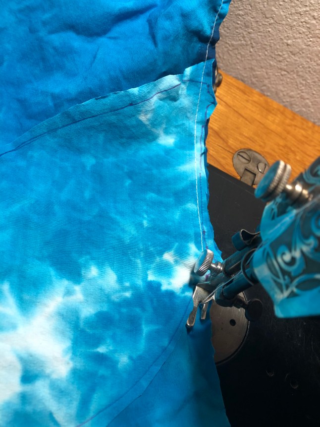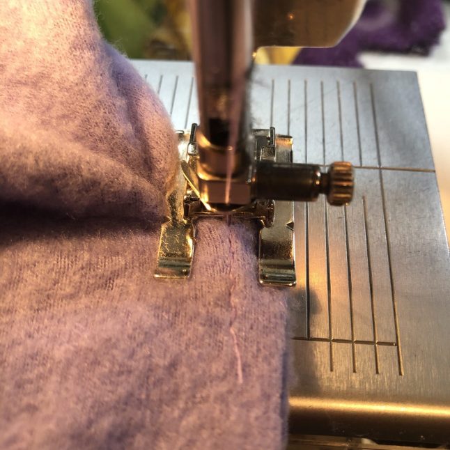 10. Time to Twist and Shout! Needle still firmly sunk, lift your presser foot. Leave the bottom layers of the hood/collar as they are, arrange the top layers of the body of your sweatshirt, so that they are now swung around to the left and behind the presser foot. You can see a tiny bit of the staystitching in the photo below. Align the raw edges here, lower the presser foot, and stitch to the next spot where the notch in the hood/collar meets up with the shoulder seam. Next stop center backs, and after that the other shoulder seam and notch. You may want to switch to a stitch with more stretch to to around the sides and back of the neckline.