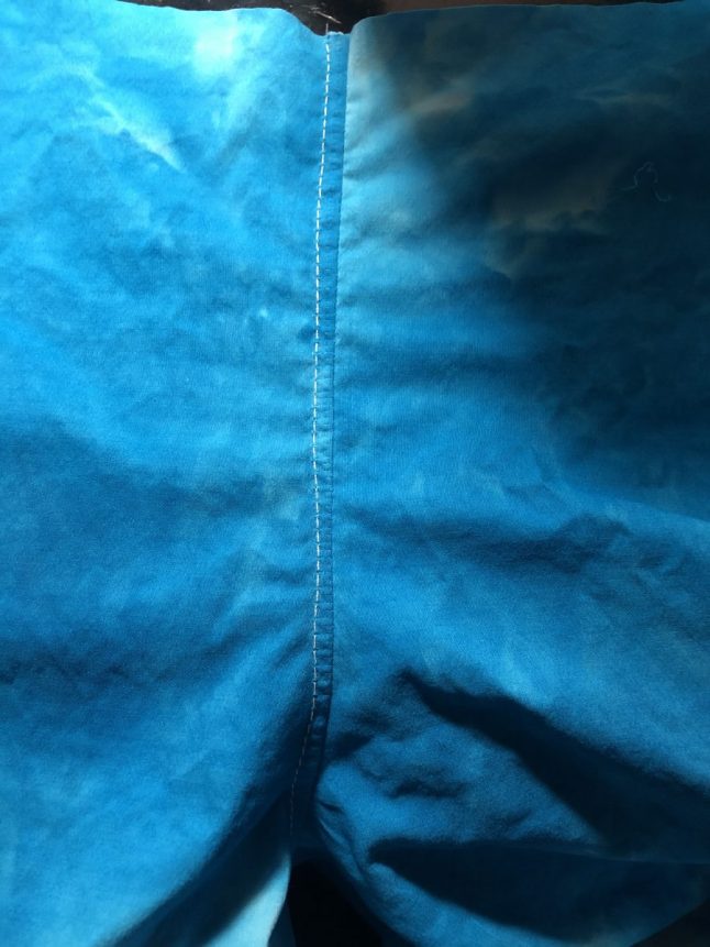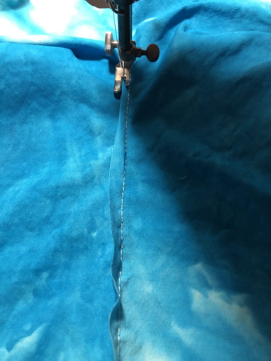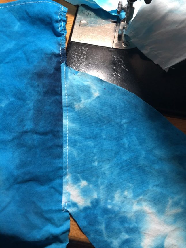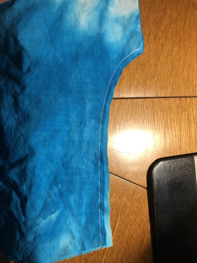 4. Prep the neckline. Staystitch the lower square neckline of the front piece. Use matching thread and with a shorter stitch length of 2, stitch from an inch above the inside corner of the neckline across the bottom and back up an inch. If you look closely, you can see my stay stitching on the wrong side of the front. It is sewn at a scant 1/4 inch seam allowance, so I do not have to remove it later.