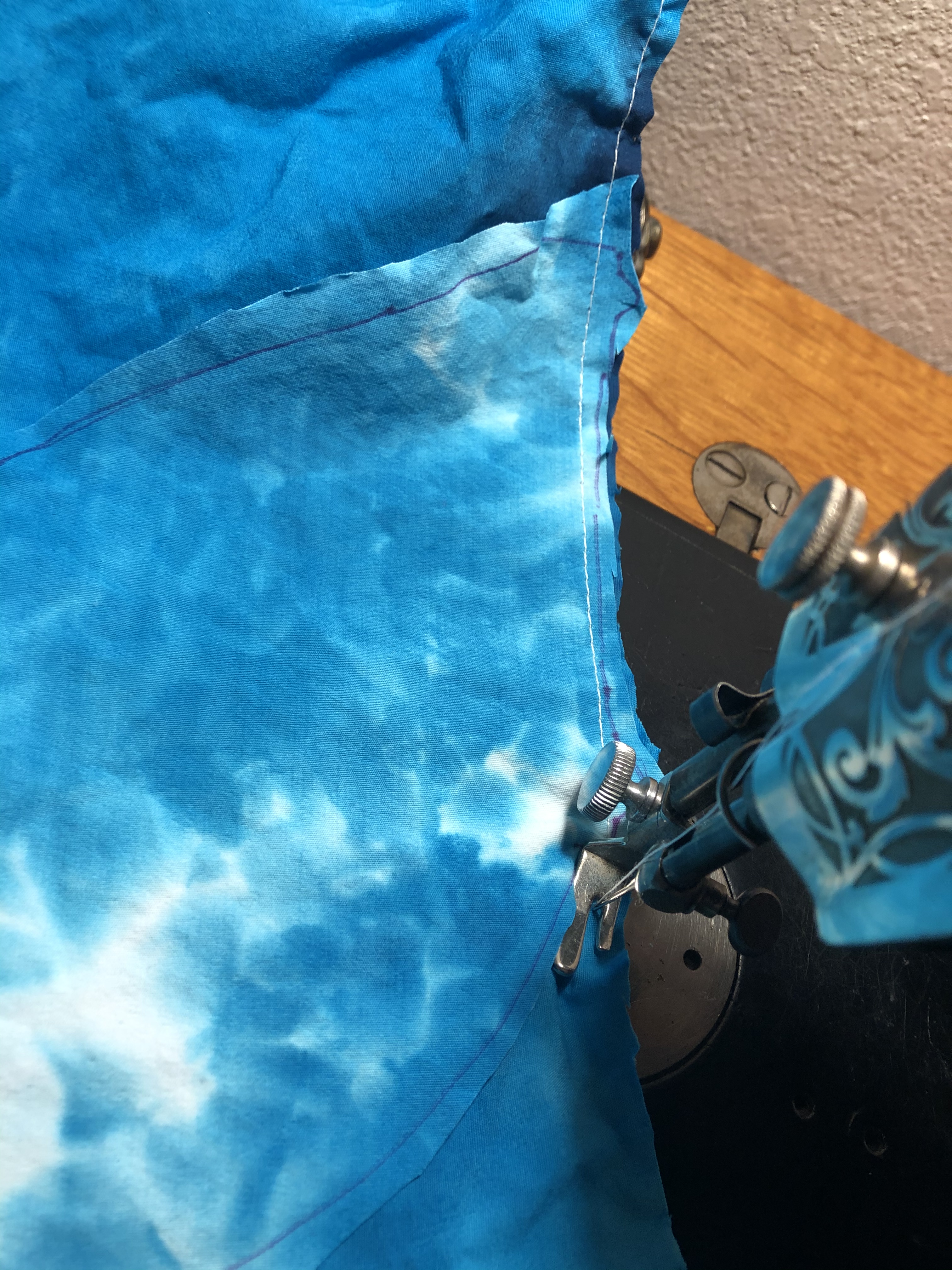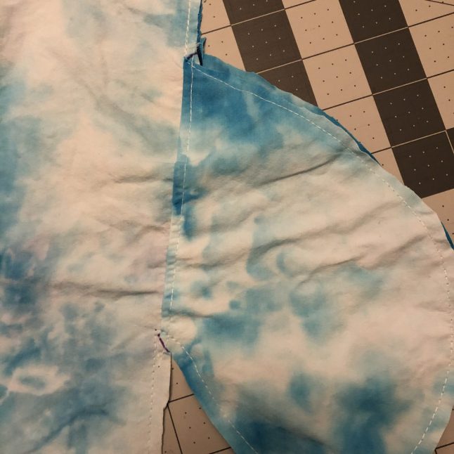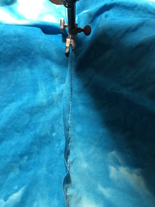 11. Almost there! In the photo below, we are getting back to where we started. You can see the initial stay stitches in the photo below. There will be excess fabric here just like there was at the first corner. Just manipulate it out of the way, so that you can minimize any puckering or tucks. When you get to that precise corner spot where you started, you can back tack or make a few stitches in place. Cut your threads and inspect your work! If you see puckers or tucks, now would be the time to correct them.