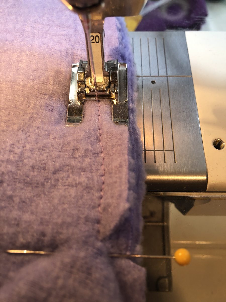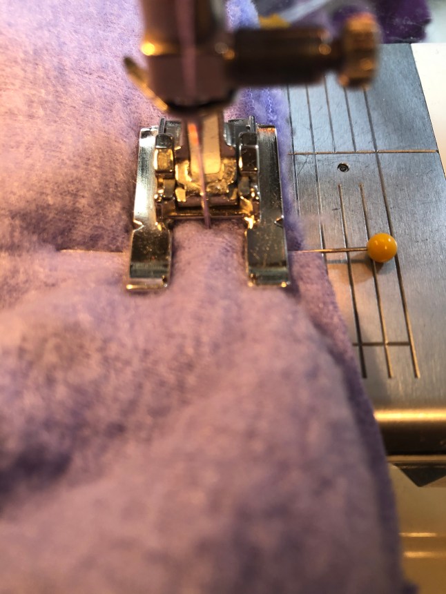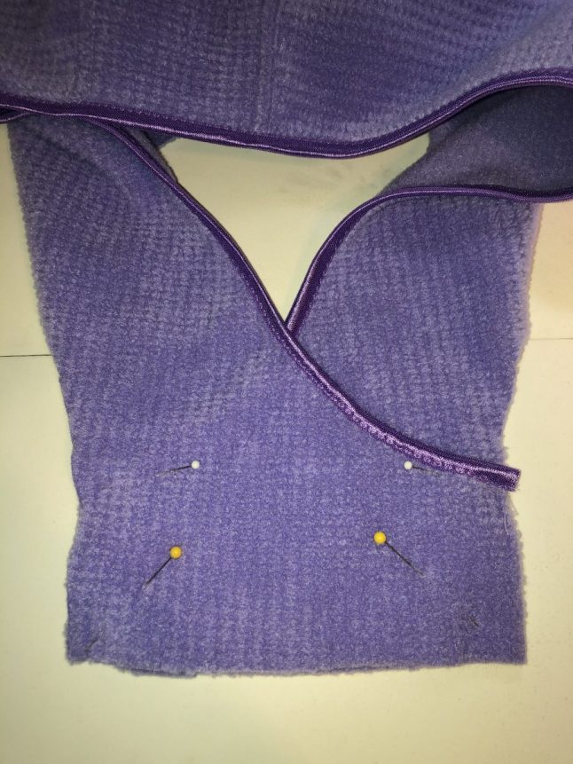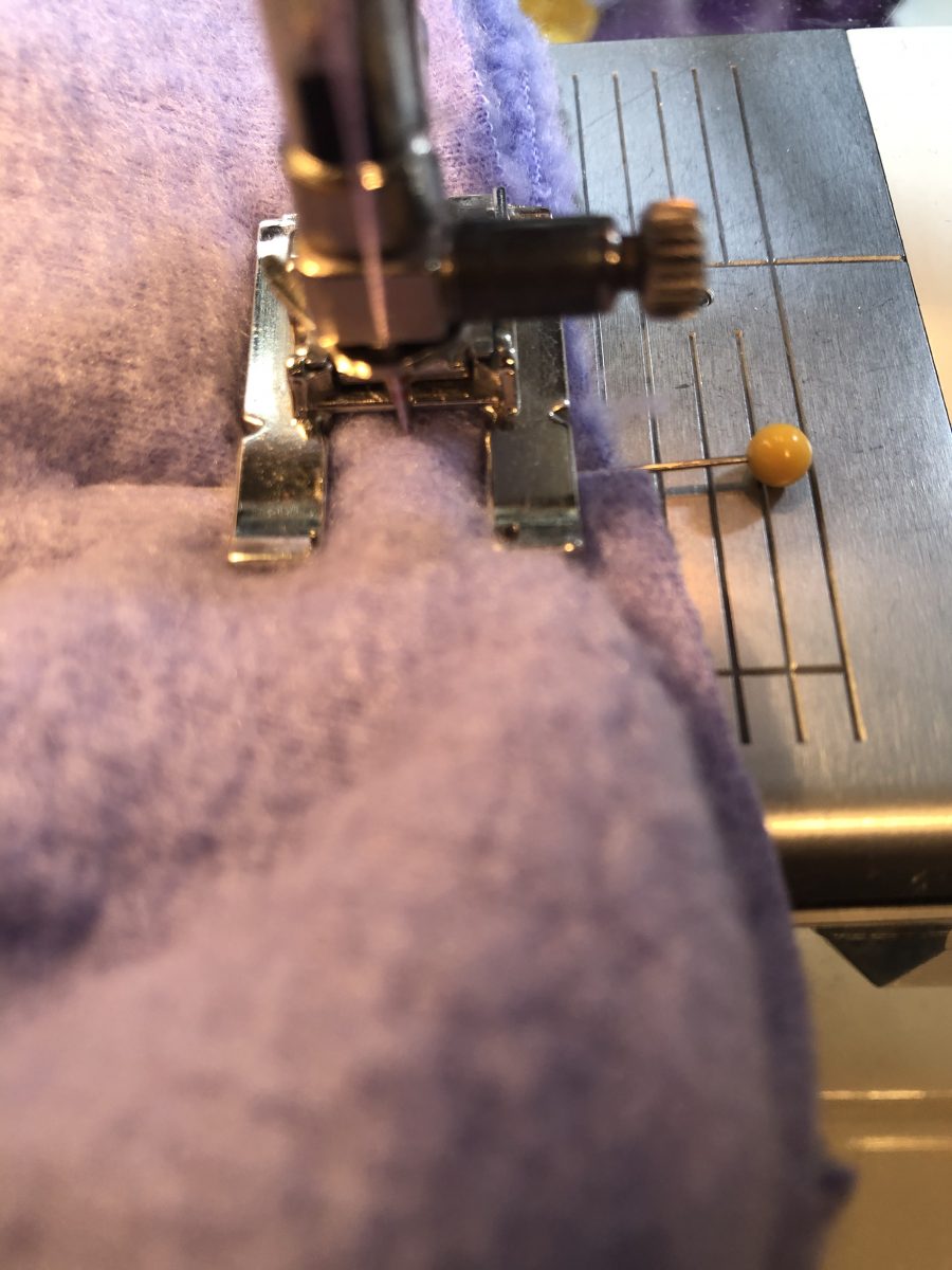 7. Attach the hood/collar to the body. Pin the right side of the lower edge of the hood/collar to the right side of the open neck edge. I pinned just outside the diagonal cuts. Double check to be sure you have the 1/4 inch of the hood/collar free on either edge, outside of the pin. With your work placed so that the hood collar is underneath, and the body is on top, we can begin sewing. the designer recommends basting this in place with a longer stitch. A stitch length of 3 is good, as it can be fairly easily removed, but will still hold and with this much loft you would want a longer stitch. Place the needle down at one corner, just inside the pin, and right on top of your stay stitching or basting stitches. Sew at this precise corner spot with a zero stitch length for a few stitches. Then stitch across the straight portion to the next corner, as pictured below. Stop precisely at the corner and make one or two stitches in place.