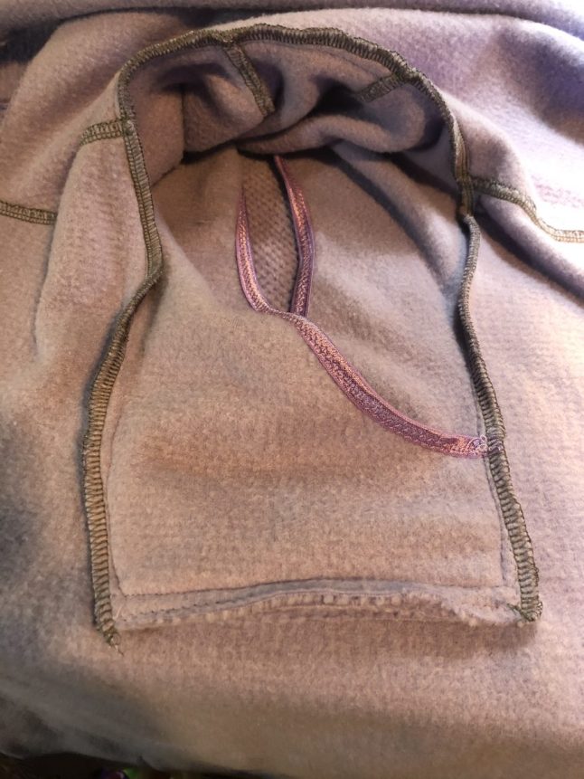 Front, back, sleeves, pocket, hood center back, and most critically, two mirror image side A hood pieces. The side B was designed to use the additional width that the zipper supplies to fit within the neckline. Don’t use that one for this project. Mark the center back neckline, and center back of the hood piece to help align them when sewing.