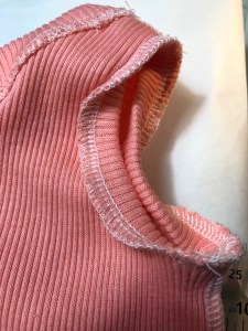 I serged one of the test garments afterwards, and that really stretched out the fabric. It could bounce back after a trip to the laundry. On an adult sized garment, serging the armscye might be a good idea. Can you tell which garment was stretched out with serging?