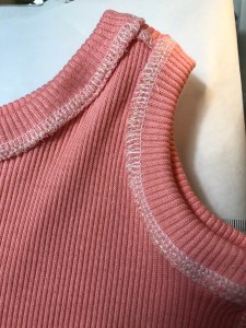 On this armscye I zig zag basted the band to the body of the top, on the edge, then serged and top stitched. On later garments, I used the stretch stitch on my machine, and it worked much better. Serging stretches out this rib knit. I hope it recovers in the laundry!